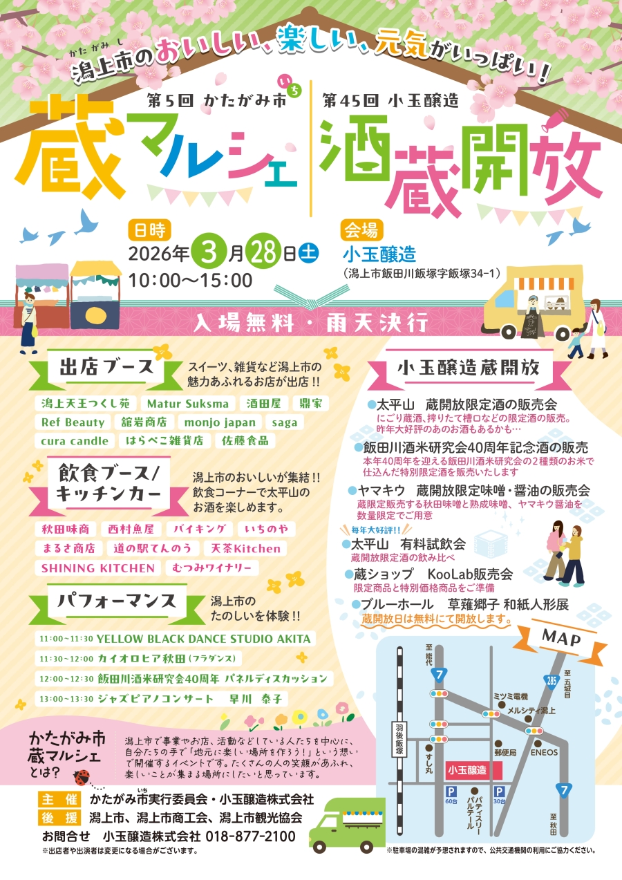 2026年3月28日(土) 10:00~15:00 入場無料/予約不要 【蔵開放 実施内容】 ・限定酒、限定味噌、限定醤油の販売 ・甘酒ふるまい ・蔵ショップ販売会 ・ブルーホール無料開放(草薙郷子さん和紙人形展) ⚠︎本年も味噌詰め放題は実施しません 【蔵マルシェ 実施内容】 ・雑貨やスイーツなどのお店が11店出店 ・飲食ブース6店 ・キッチンカー2店 【パフォーマンス】 ・キッズダンスショー 11:00~11:30 ・フラダンス 11:30~12:00 ・飯田川酒米研究会40周年パネルディスカッション 12:00~12:30 ・ジャズピアノコンサート13:00~13:30 ⚠︎開催内容は現時点での予定となっており、変更になる場合もございます